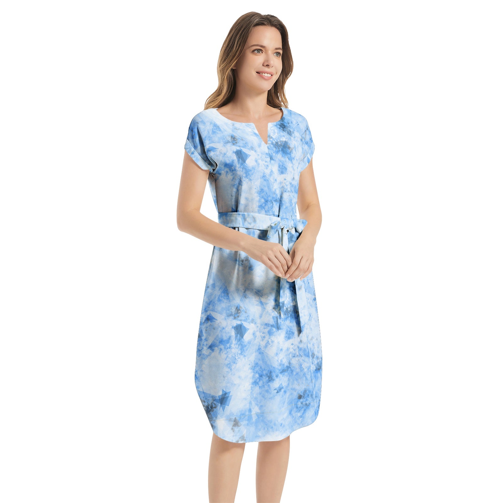 Batwing sleeve, Notched Neck, Pull on closure, Belted waist, Straight hem, Two side inseam pockets, Women's casual midi dress
